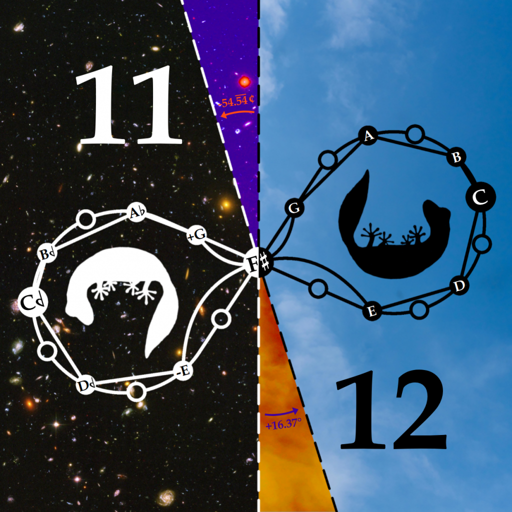 For this song i „invented“ a new bit of music theory. The song is written in lydian in both 12 and 11 EDO, wheras the two systems are coupled via the augmented 4ths. Since the augmented 4th in 11 EDO is quite a bit higher at 654.55 cents and can almost be considered a low perfect fifth, the whole 11 EDO system has to be shifted down by the difference which is 654.55 – 600 cents = 54.55 cents. This causes the root note of the 11 EDO system to be pretty much a quarter tone flat compared to the 12 EDO system.